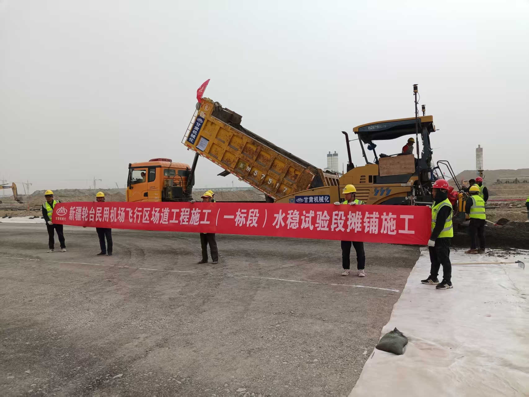 3月27日,新疆輪臺民用機場項目現場,隨著首車水泥穩(wěn)定砂礫混合料倒入攤鋪機,其緩緩啟動,我司承建的該項目飛行區(qū)場道工程(一標段)水穩(wěn)基層施工正式開啟。